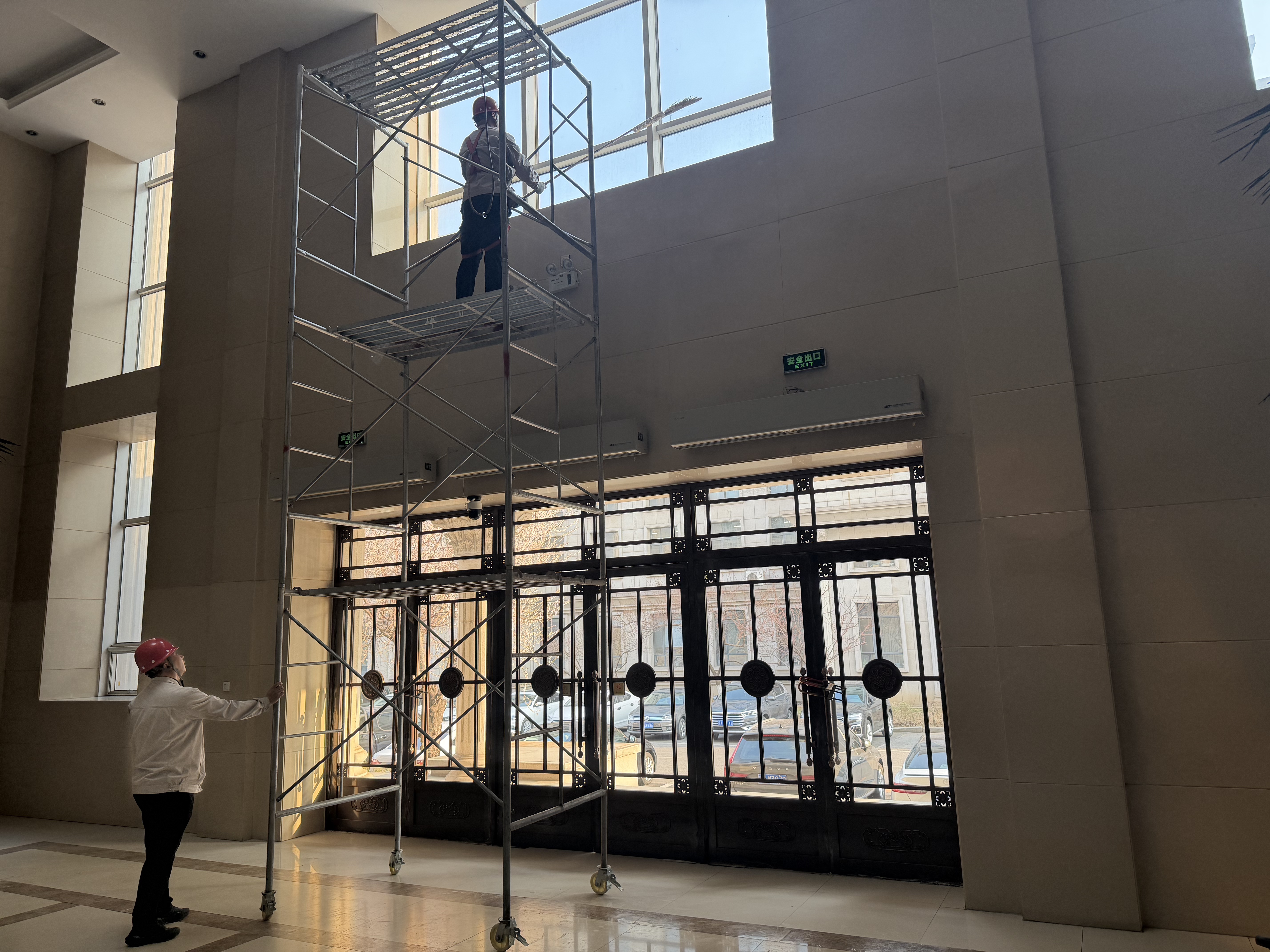 針對(duì)挑高墻面、高空玻璃等日常清潔難以覆蓋的區(qū)域,工作人員搭建移動(dòng)腳手架,佩戴安全防護(hù)裝備,使用專(zhuān)業(yè)清潔工具對(duì)墻面污漬、玻璃浮塵進(jìn)行徹底清理。地面區(qū)域同步進(jìn)行深度拖洗、污漬清除,不放過(guò)任何衛(wèi)生死角,以細(xì)致入微的作業(yè)標(biāo)準(zhǔn)對(duì)公共區(qū)域進(jìn)行全方位“大掃除”。